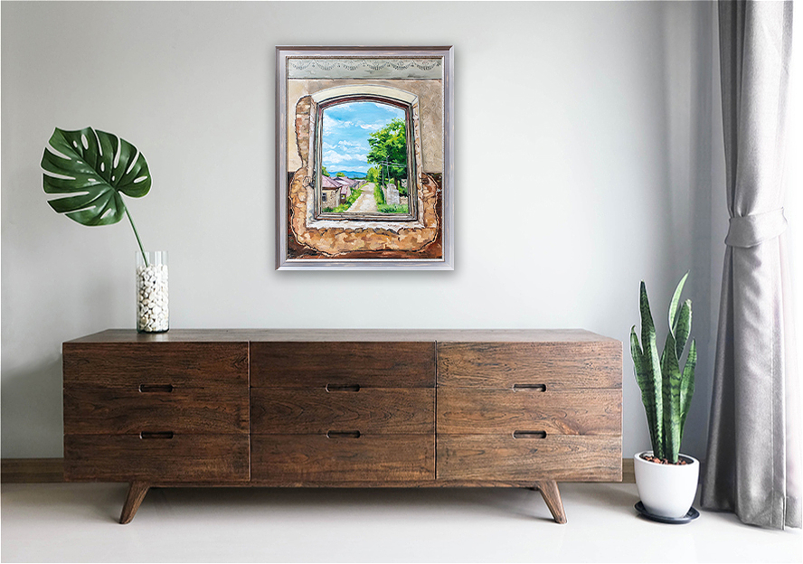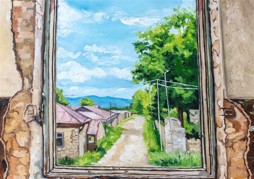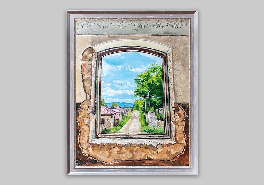 Kətan üzərində yağlı boya ilə işlənmiş bu kompozisiya, izləyicini Şuşada yerləşən Realnı məktəbinin köhnə, uçuq-sökük bir divarın pəncərəsindən gözəl bir mənzərəyə baxmağa dəvət edir.