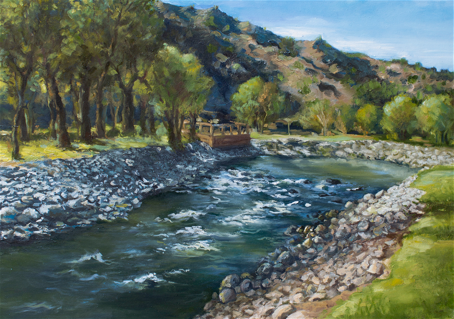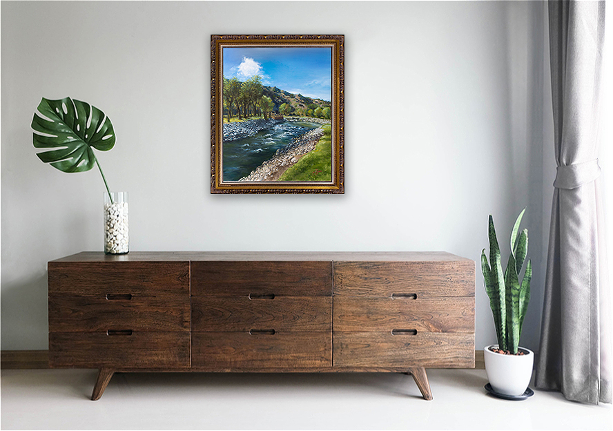 Rəssam suyun köpüklənən dalğalarını ağ və açıq mavi çalarlarla, sahildəki daşları isə boz və qəhvəyi tonlarla aydın şəkildə təsvir edib. Çayın kənarındakı yaşıl ağaclar və arxa plandakı uca dağ silsiləsi məkana sükunət və əzəmət qatır, aydın mavi səma isə ümumi kompozisiyaya parlaqlıq bəxş edir.