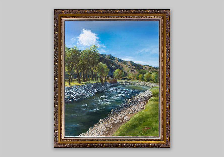 Kətan üzərində yağlı boya ilə işlənmiş bu əsər Qarabağın dağ çaylarından birinin coşqun axarını realizm üslubunda əks etdirir.