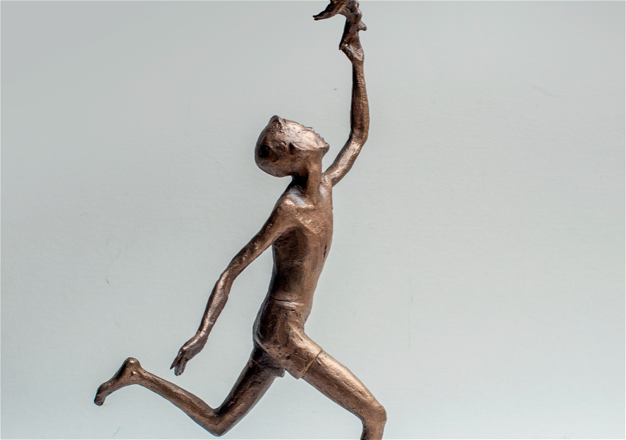 Bürünc materialın isti qızılı tonları fiqurun üzərində yumşaq işıq oyunları yaradır, uzanan qol və havaya qalxan quşlar kompozisiyanı yuxarı istiqamətdə hərəkətə gətirir.