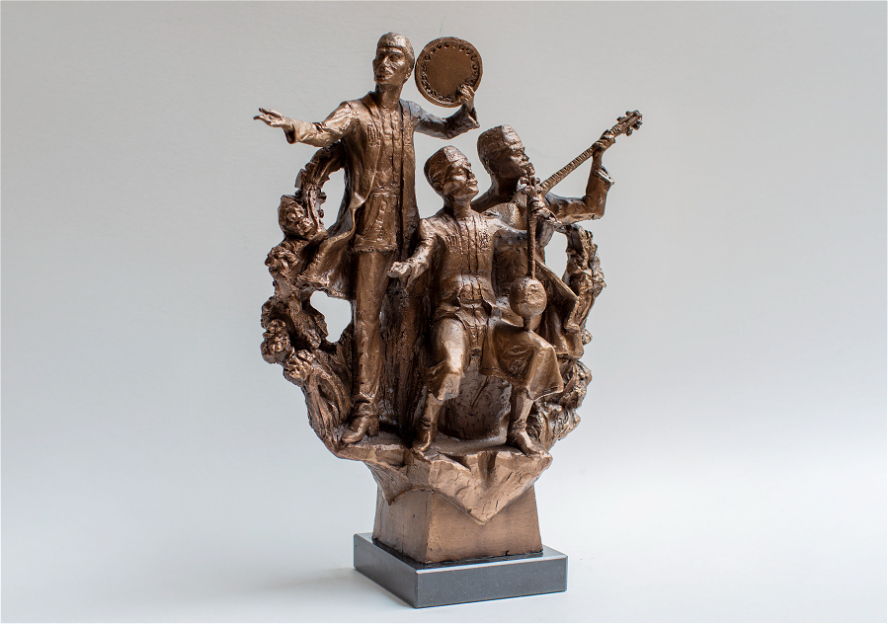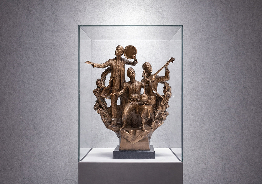 Bürünc materialın isti tünd-qızılı çalarları fiqurların üzərində ritmik işıq oyunları yaradır. Heykəltəraşlıqda çoxfiqurlu kompozisiya dinamik plastika ilə qurulmuş, hər bir obraz musiqi alətləri vasitəsilə fərqli istiqamətə yönələn hərəkət ritmini ifadə edir.