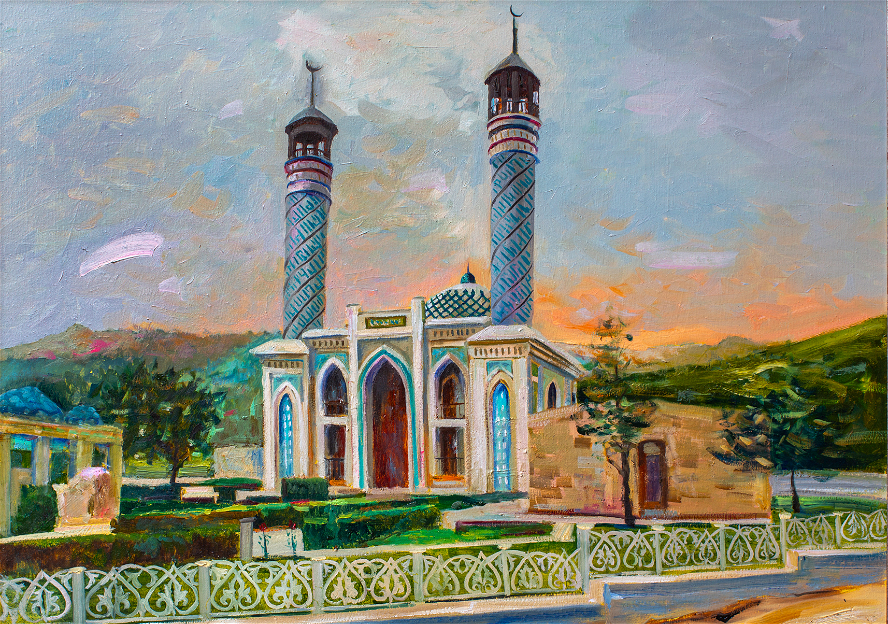 Zəngilan məscidinin zərif silueti bu əsərdə günəşin qızılı şəfəqləri ilə elə bir vəhdət yaradır ki, abidə sanki əsrlərin yaddaşını özündə daşıyan sarsılmaz bir sütun kimi göylərə ucalır.
