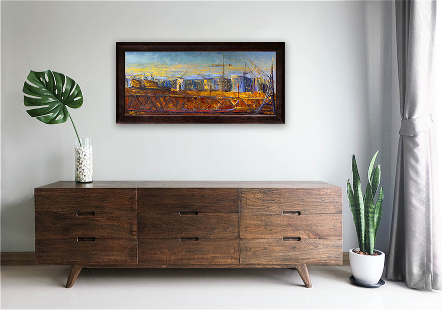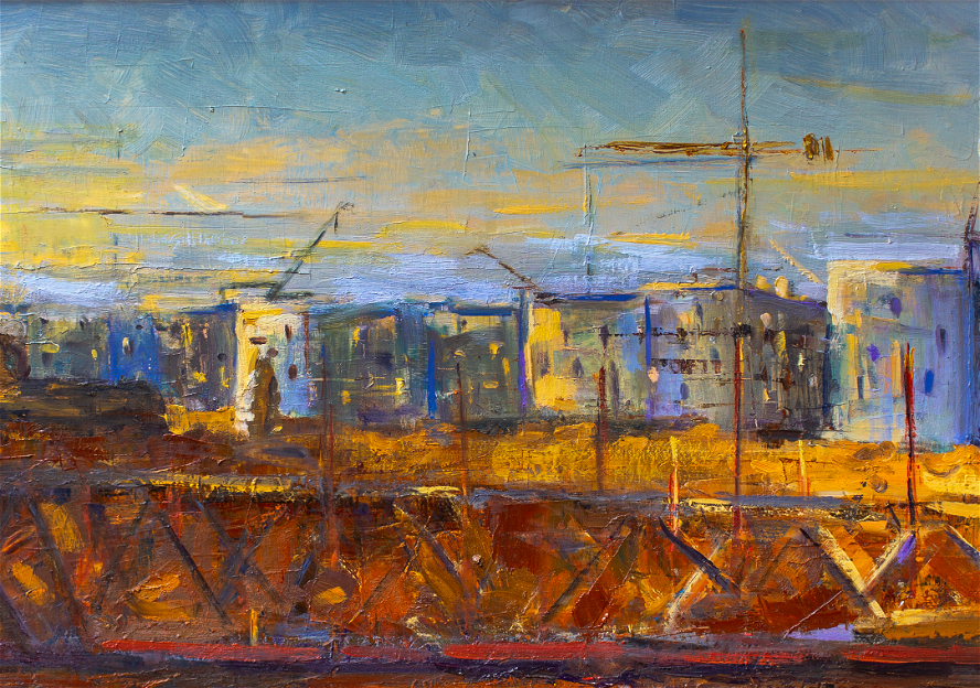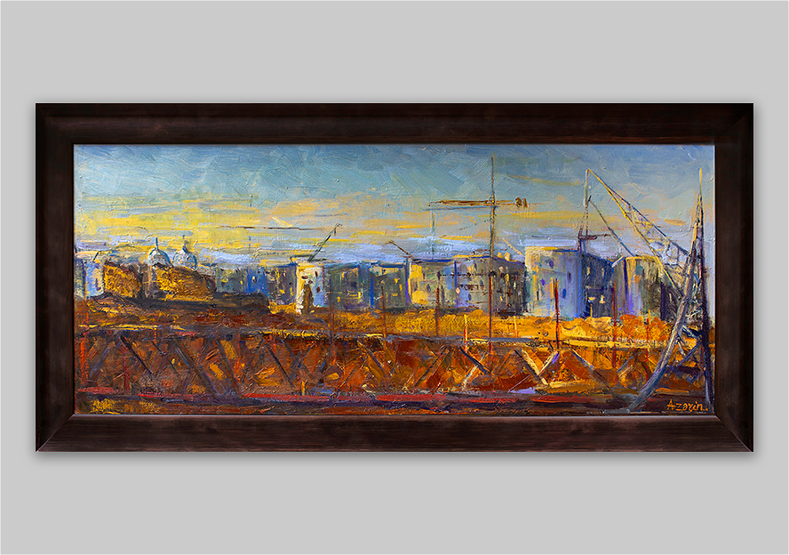 Kompozisiyada ritmik yüksəliş xətləri və struktur formalar hərəkət və inkişaf enerjisi yaradır, fakturalı fırça zərbələri isə genişmiqyaslı dəyişimin tempini hiss etdirir.