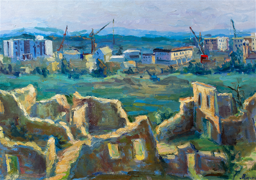 Arxa planda isə mavi-yaşıl çalarlarla qurulan müasir Ağdamın silueti və tikinti kranları diqqəti cəlb edir.