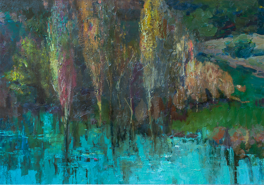 Şaquli fırça vuruşları suyun dərinliyi ilə göyün sonsuzluğunu elə bir zərifliklə birləşdirir ki, ağaclar iki dünya arasında dayanan canlı sütunlara çevrilir.